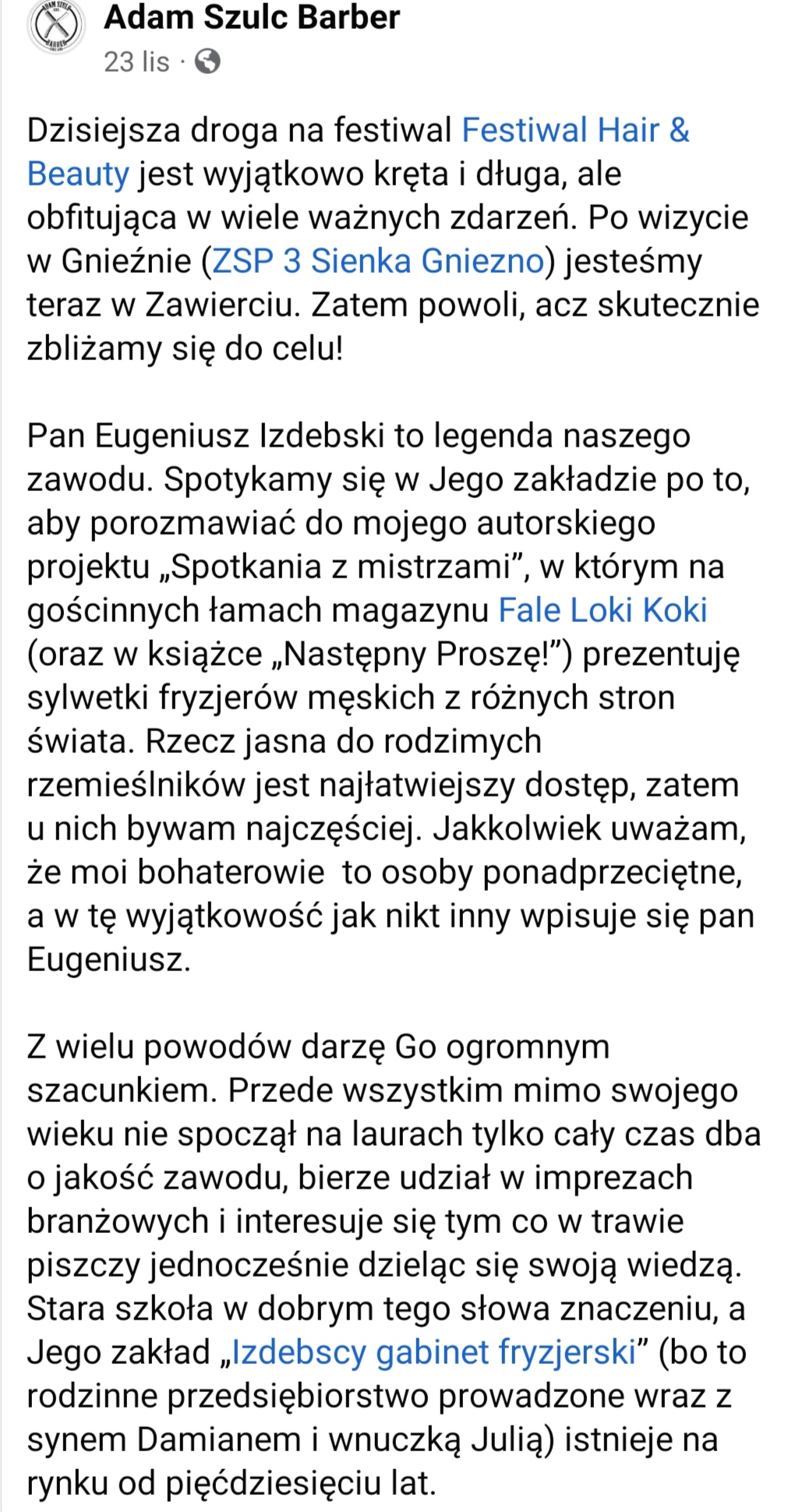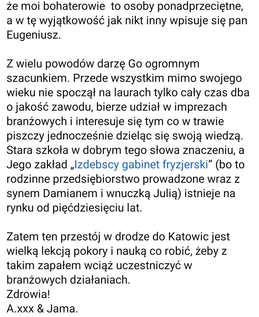 "Przypomnijmy więc, że Pan Eugeniusz Izdebski, od 30 lat Mistrz Fryzjerski posiadający swój salon w Zawierciu – jest kreatorem mody fryzjerskiej i profesorem w szkole zawodowej w Katowicach. Jego pasją jest nie tylko fryzjerstwo ale i historia. Chcąc przekazać swoją wiedzę młodemu pokoleniu, autor spędził 5 lat w bibliotekach, zbierając materiały do swej pracy o historii rzemiosła fryzjerskiego. Publikujemy ten interesujący szkic z nadzieją, że zaciekawi naszych Czytelników. Podobnie jak On, chcielibyśmy, aby fryzjerzy byli nie tylko kreatorami fryzur, ale także doradcami swoich klientów, lekarzami włosów i aby mogli świadczyć usługi najwyższej jakości. Pracując przy użyciu najlepszych profesjonalnych produktów w salonach, gdzie równie ważne są elegancja i estetyka".
